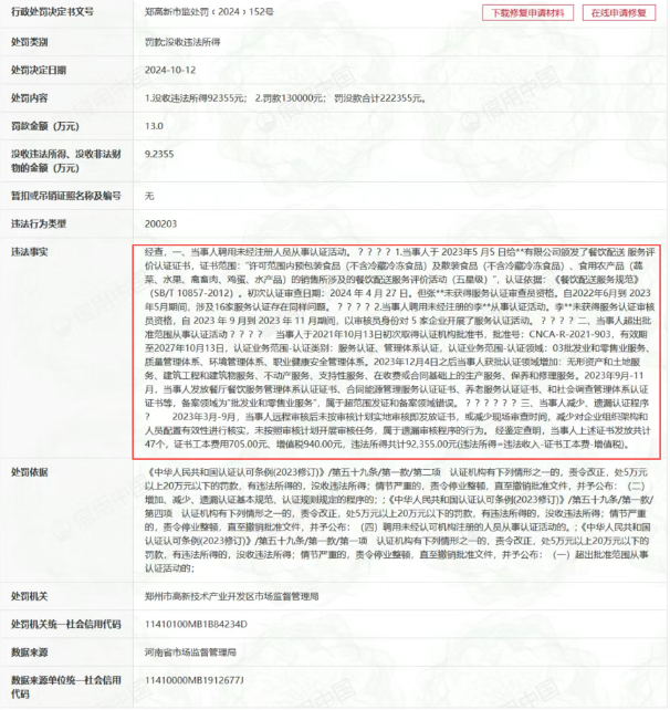 据信用中国官网信息公示,**认证有限公司分别于2025年9月、2025年3月、2024年10月因增加、减少、遗漏认证基本规范和认证规则规定及聘用未经注册人员从事认证活动、超批准范围从事认证活动等原因被各地市场监督管理局处罚,一年内处罚高达3次。详情如下:
