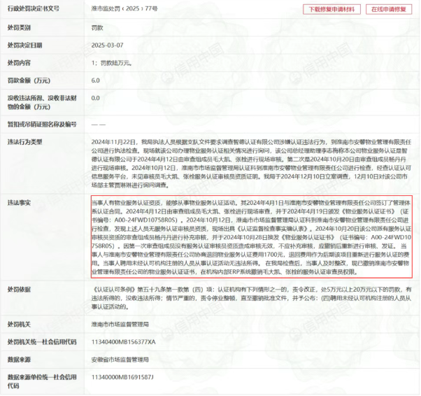 据信用中国官网信息公示,**认证有限公司分别于2025年9月、2025年3月、2024年10月因增加、减少、遗漏认证基本规范和认证规则规定及聘用未经注册人员从事认证活动、超批准范围从事认证活动等原因被各地市场监督管理局处罚,一年内处罚高达3次。详情如下: