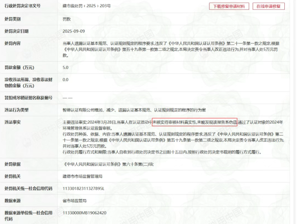 据信用中国官网信息公示,**认证有限公司分别于2025年9月、2025年3月、2024年10月因增加、减少、遗漏认证基本规范和认证规则规定及聘用未经注册人员从事认证活动、超批准范围从事认证活动等原因被各地市场监督管理局处罚,一年内处罚高达3次。详情如下: